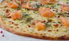 Base crème, mozzarella, persillade, saumon fumé.