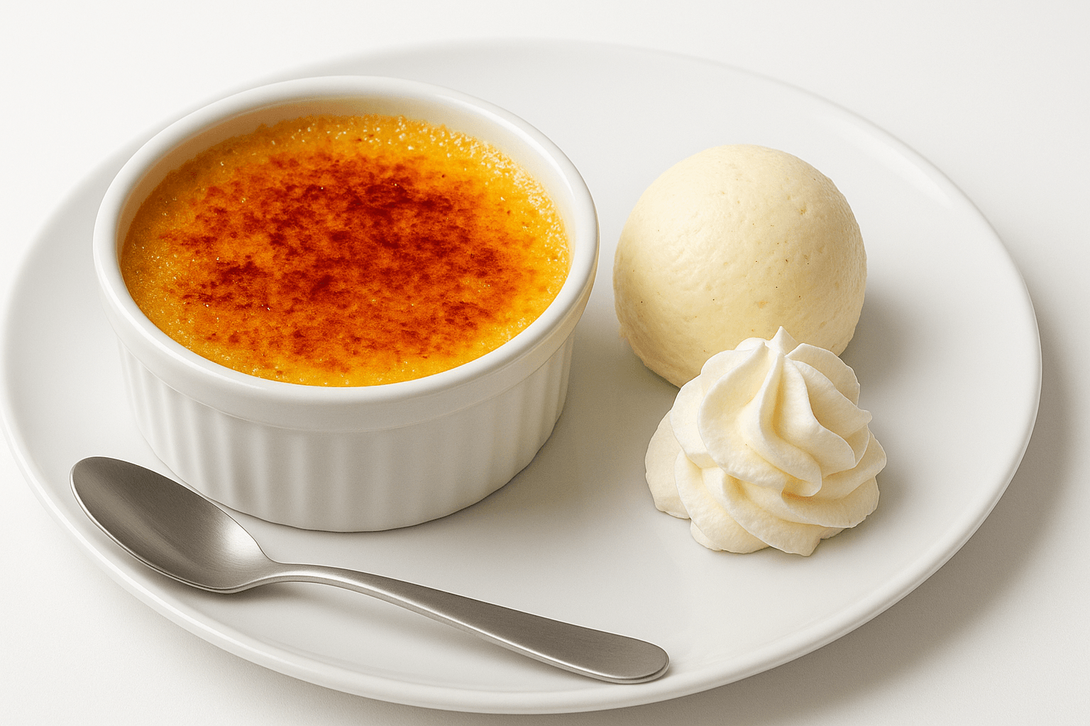 Crème brûlée avec sa boule de glace vanille et chantilly