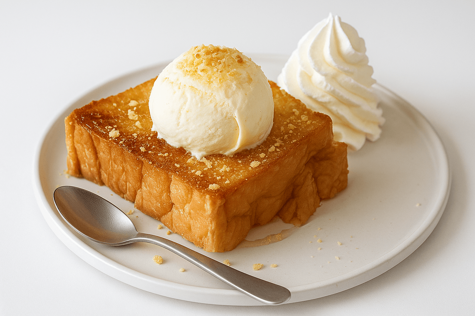 Brioche façon pain perdu avec sa boule de glace Vanille et Chantilly.
